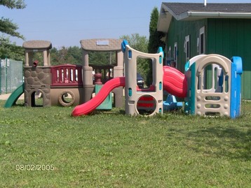 | For the little guys who do not want to play on the other playground, we offer this smaller play system by the shower house / laundry facility and the inground swimming pool. |